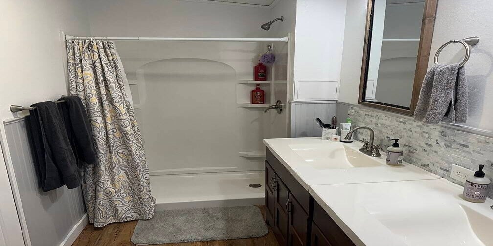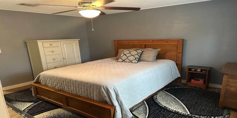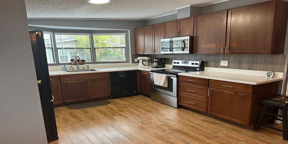 This charming 2-bedroom, 2-bathroom unfurnished manufactured home in the desirable Pine Lakes Country Club community of North Fort Myers, Florida, offers comfortable living with numerous updates and desirable features. The spacious kitchen boasts Corian solid surface countertops, updated cabinets, Whirlpool appliances, and a convenient pantry. The large guest bedroom includes a generous walk-in closet, while the guest bathroom features an updated basin with a Silestone top and a walk-in shower. The master bedroom is a true retreat, easily accommodating a queen-size bed and a seating area, along with a large walk-in closet and an updated en-suite bathroom with a vanity base and a walk-in shower. Both bathrooms are equipped with comfort height toilets.